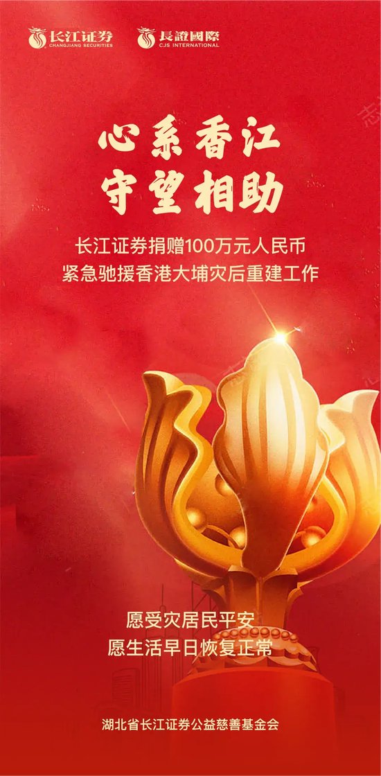 灾情就是命令,关怀穿越山海。为全力支持受灾居民紧急安置、生活物资补给及社区恢复,长江证券联合香港子公司长证国际,通过湖北省红十字会紧急向香港大埔区捐赠100万元人民币,以实际行动践行国企担当,与香港社会各界风雨同舟、共克时艰。